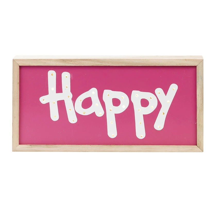 Cadre lumineux en bois. Message printé avec leds. Fonctionne avec 2 piles AA LR06 non fournies. Interrupteur au dos avec emplacement piles. 2 crochets au dos pour pouvoir le suspendre.