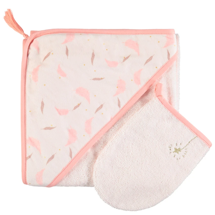 Cape de bain en éponge à capuche intégrée motif plumes et petit pompon.