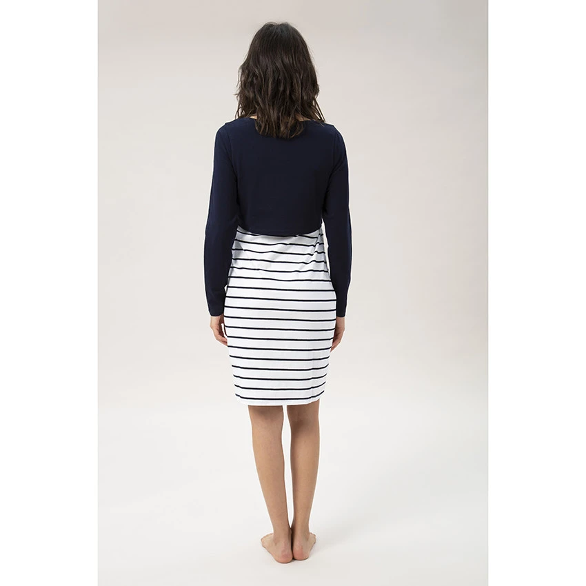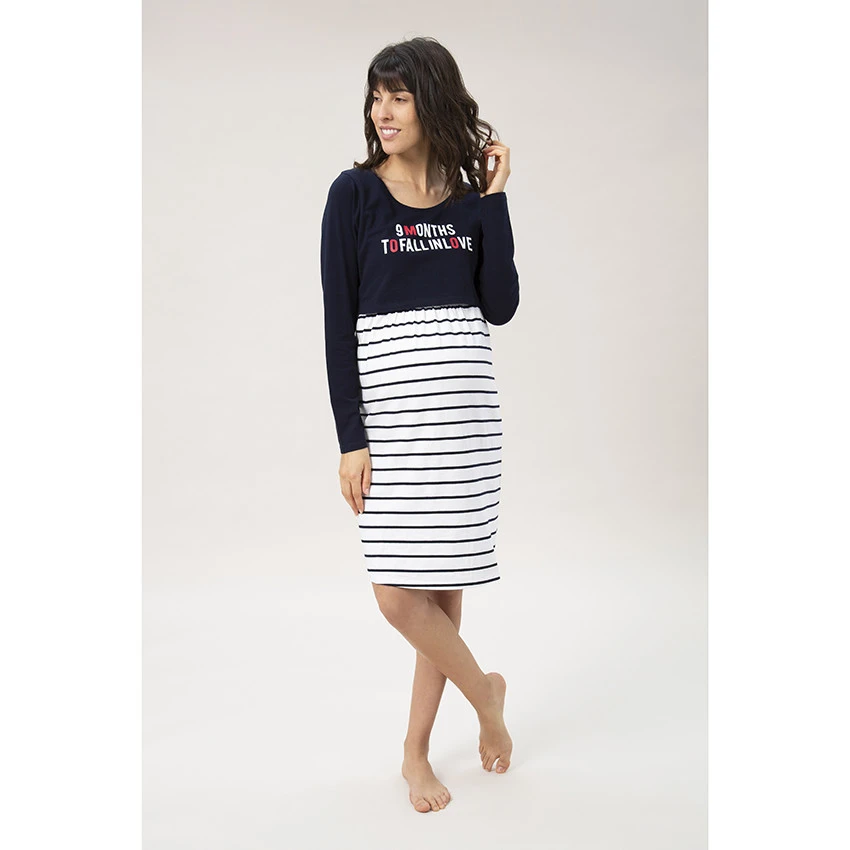 Chemise de nuit manches longues bicolore de grossesse et d’allaitement. Encolure ronde. Message printé devant. Effet de superposition avec brassière intégrée. Bas de la chemise de nuit rayé.