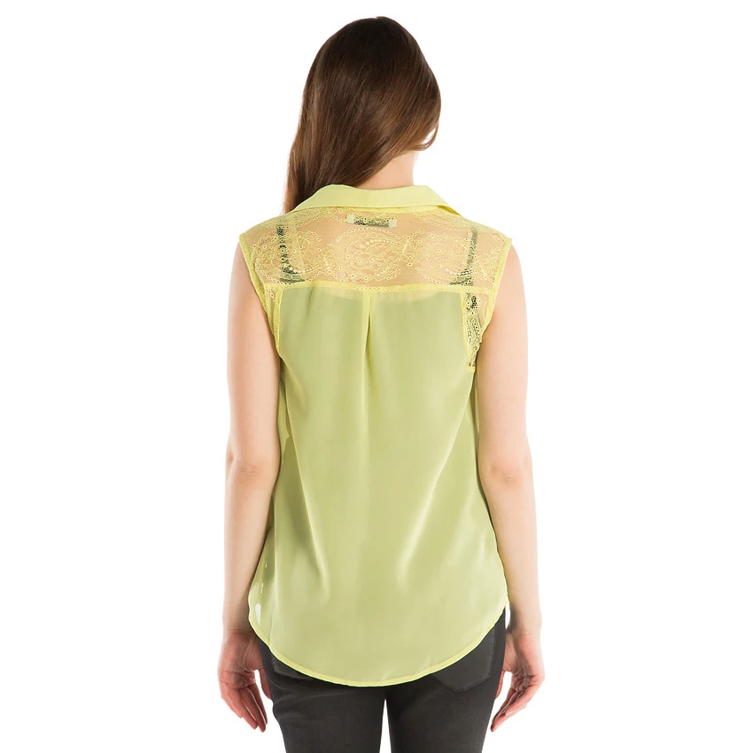 Chemise manches courtes unie. Col chemise. Ouverture pressionnée sur toute la longueur devant. Emmanchures et haut du dos en dentelle.