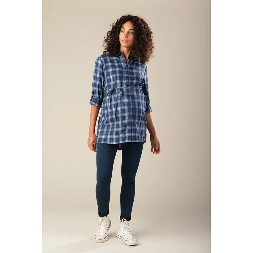 Chemise manches longues à carreaux. Col chemise. Ouverture boutonnée sur le devant. Cordon à la taille. Manches retroussables