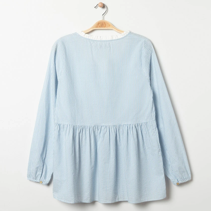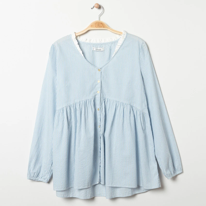 Chemise de grossesse manches longues à fines rayures verticales. Col V volanté. Ouverture boutonnée devant. Poignets boutonnés. Coupe ample.