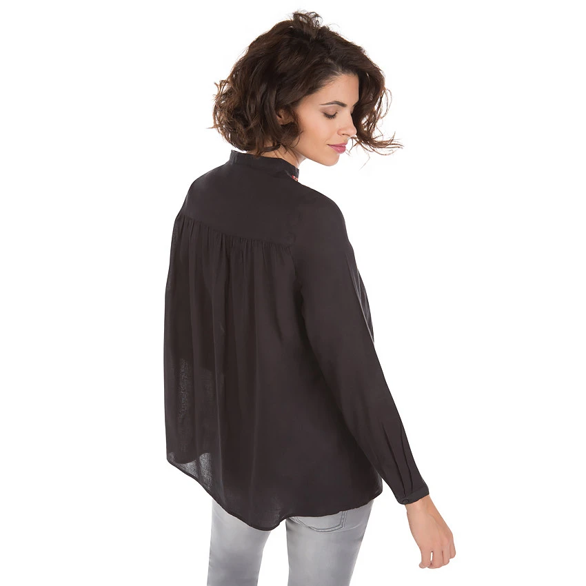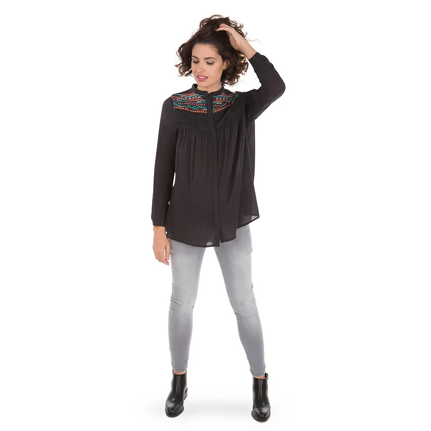 Chemisier en voile de coton. Col mao avec ouverture boutonnée sur toute la longueur devant. Haut du chemisier avec jeu de plis et broderies. Bracelet 1 bouton au bout des manches. Bas du chemisier ample.