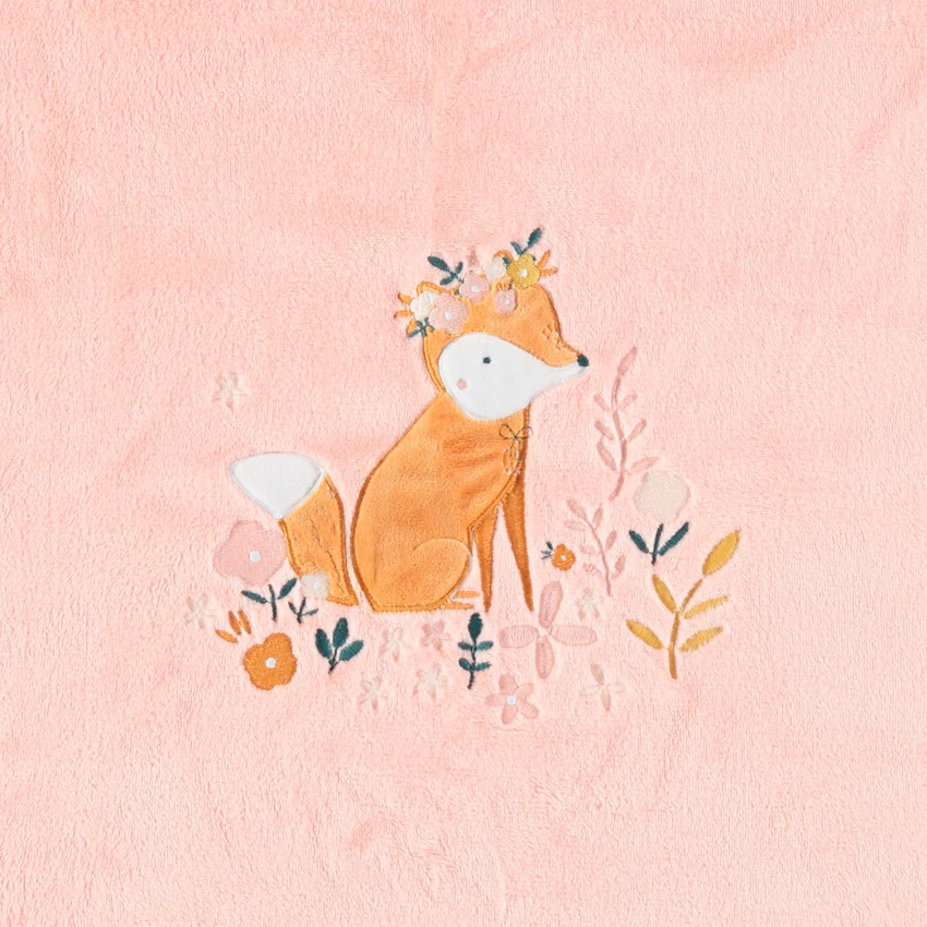 Couverture en sherpa unie. Renard brodé devant avec motifs floraux.