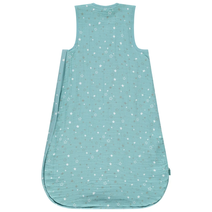 Gigoteuse sans manches avec étoiles imprimées en gaze de coton. Bretelles pressionnées. Ouverture zippée sur le côté pour faciliter l’habillement de bébé.