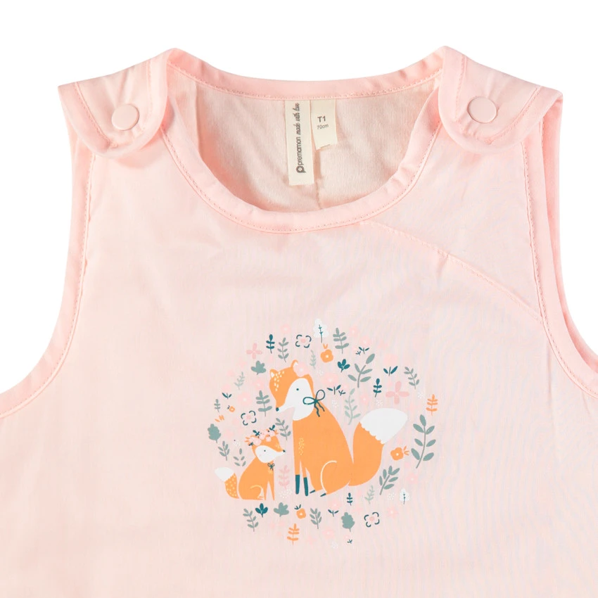 Gigoteuse sans manches en popeline avec renards printés sur le devant. Dos uni. Doublure en jersey. Bretelles pressionnées. Ouverture zippée sur le côté pour faciliter l’habillement de bébé.