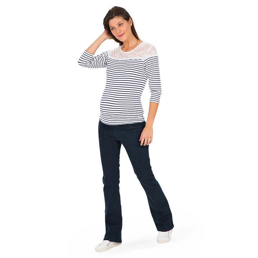 Jeans de grossesse brut. Bandeau haut pour plus de confort et de maintien. Ceinture à passants avec découpe braguette. 2 poches cavalières devant. 2 poches plaquées au dos.