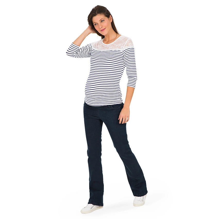 Jeans coupe bootcut. Bandeau haut pour maintenir le ventre. 2 poches cavalières sur le devant. 2 poches plaquées au dos avec motif fantaisie brodé.