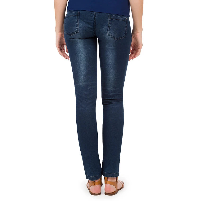 Jeans de grossesse effet used et crinkle. Coupe slim. 2 poches cavalières devant avec clous fantaisie sur celle de gauche. Découpe ceinture à passants avec bouton agrafe. Bandeau haut en jersey pour plus de confort et de maintien au niveau du ventre. 2 poches plaquées au dos. Rivets métal.
