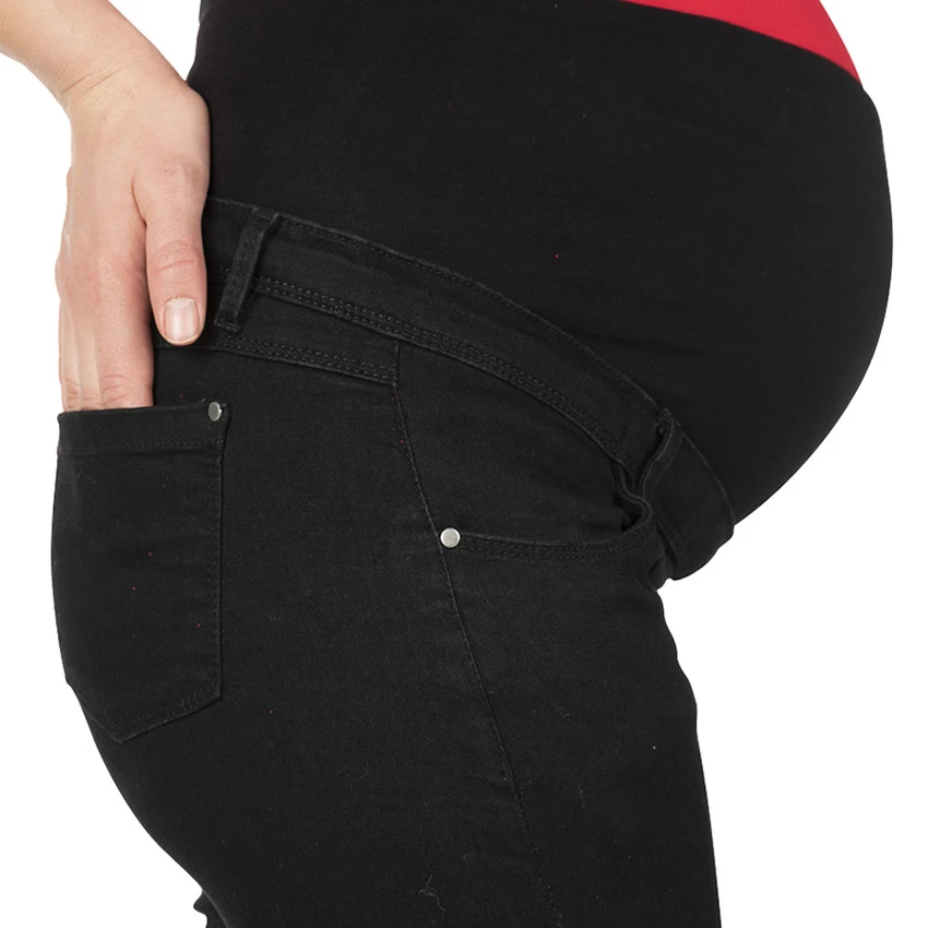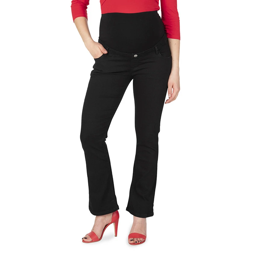 Jeans de grossesse évasé en bas. Bandeau haut en jersey. Ajustable de l’intérieur. Ceinture à passants. 2 poches plaquées au dos.
