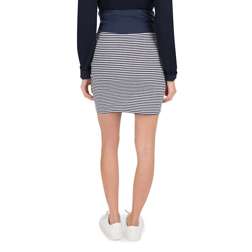Jupe de grossesse en jersey à rayures. Bandeau haut en jersey pour un maximum de confort. Longueur mi-cuisse.