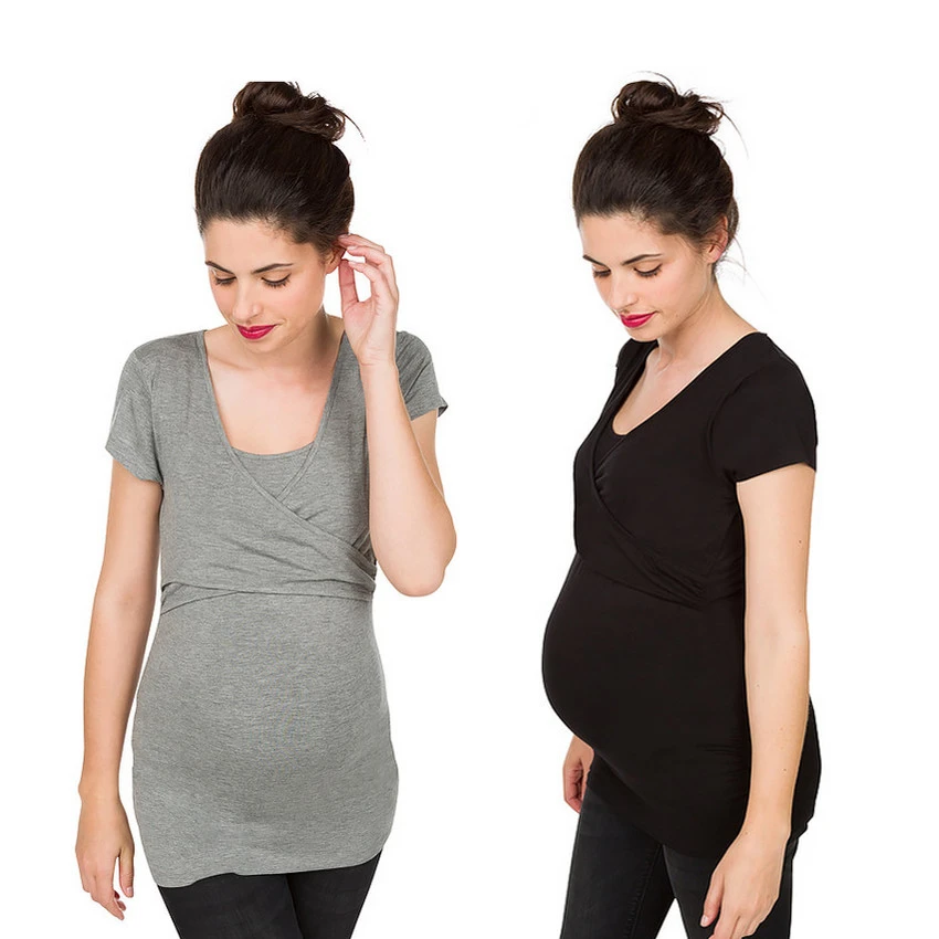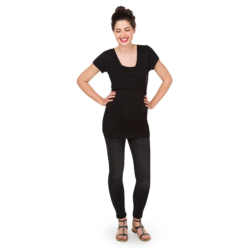 Lot de 2 tee-shirts de grossesse et d’allaitement en jersey. Manches courtes. Encolure croisée devant avec brassière à l’intérieur pour faciliter l’allaitement. Dos uni. Matière stretch qui confèrera un confort optimal.
