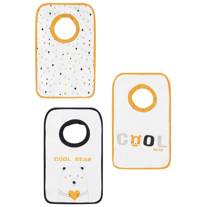 Lot de 3 bavoirs en jersey à enfiler. 2 modèles unis avec motif ours. 1 modèle imprimé triangles.