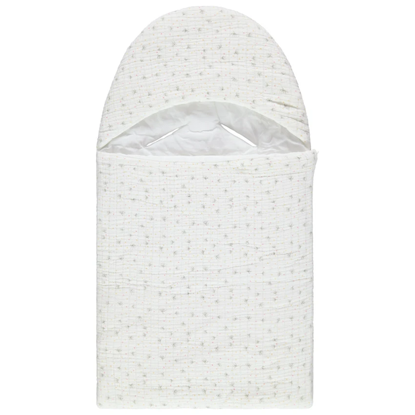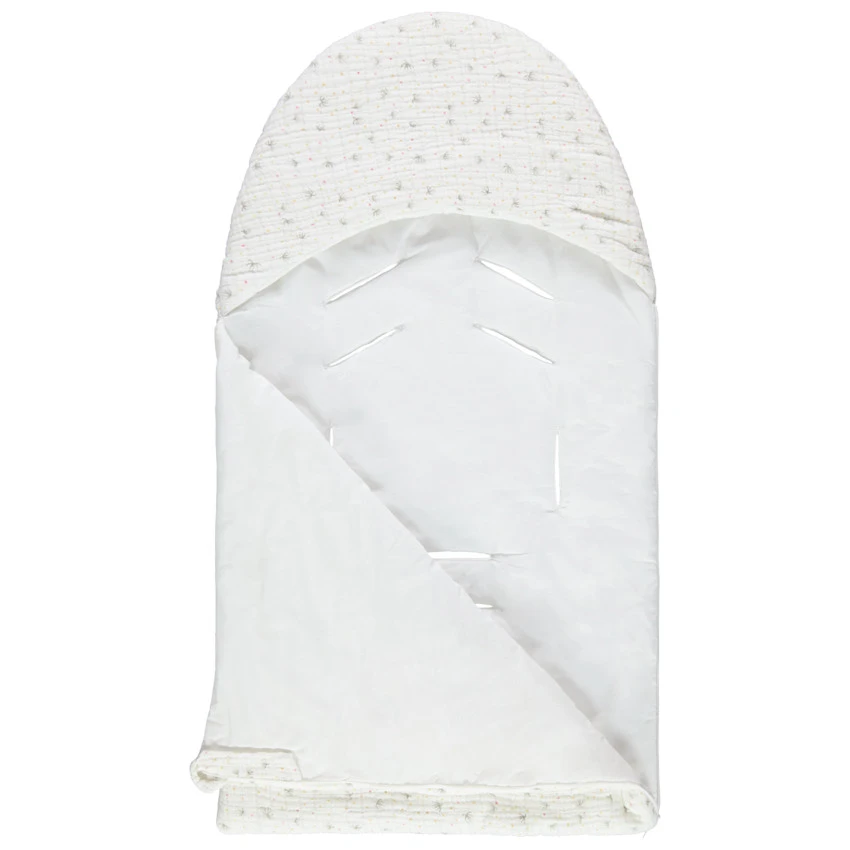 Le nid d’ange est composé d’une ouverture 8 points au dos afin d’y passer les sangles du couffin, du siège-auto ou de la poussette.