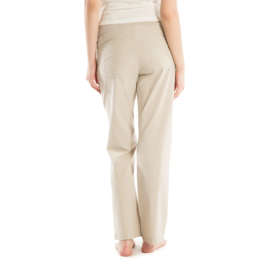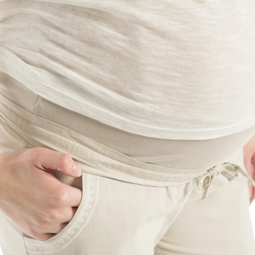 Pantalon uni de grossesse. Taille avec cordons de serrage. Bandeau haut élastiqué. 2 poches coupées devant avec print effet broderie. 2 poches plaquées au dos.
