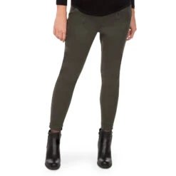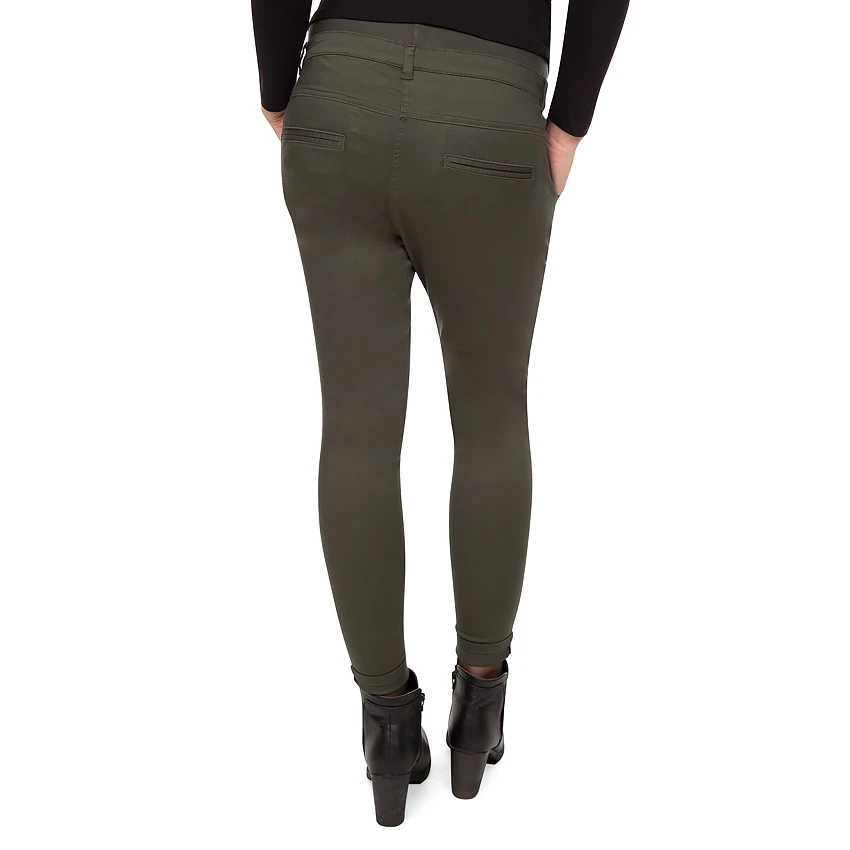 Pantalon de grossesse coupe chino surteint. Fitté sur les jambes. Taille ajustable de l’intérieur par élastiques et boutons. Ceinture à passants avec bouton agrafe et braguette zippée. 2 poches cavalières devant. Bandeau haut en jersey pour plus de confort et de maintien. 2 poches passepoilées au dos.