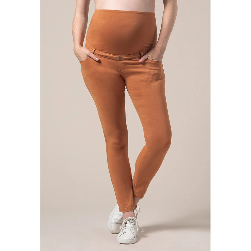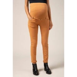 Pantalon de grossesse coupe slim. Taille ajustable de l’intérieur par élastique et boutons. Ceinture à passants avec bouton et braguette zippée. 2 poches cavalières. Large bandeau en jersey pour un meilleur maintien. 2 poches plaquées au dos.