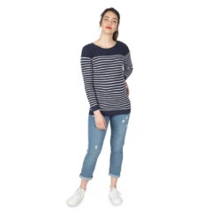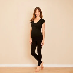 Pantalon coupe droite de grossesse en lin et coton. Bandeau haut en bord-côte. Découpe ceinture à passants avec bouton et liens à nouer. 2 poches coupées devant. 2 poches à rabat boutonné au dos.