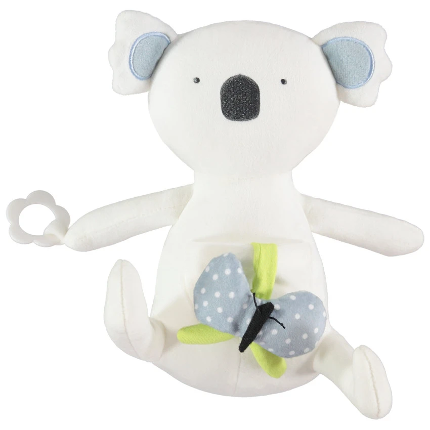 Un koala trop mignon pour éveiller les sens de bébé et savourer des moments jeux. Peluche d’activités koala avec détails brodés et papillon sur le devant.
