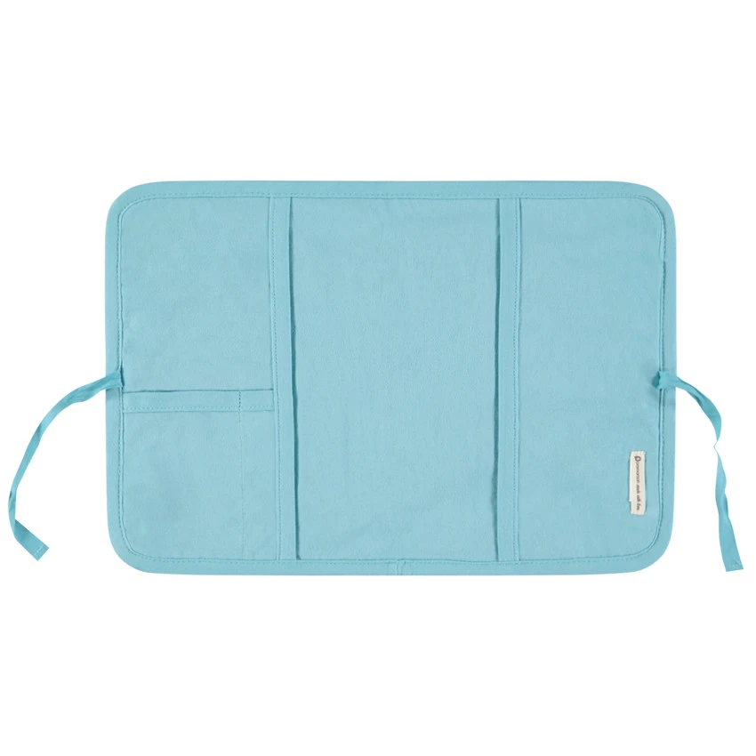 Intérieur uni bleu avec compartiments. Ouverture par liens à nouer.