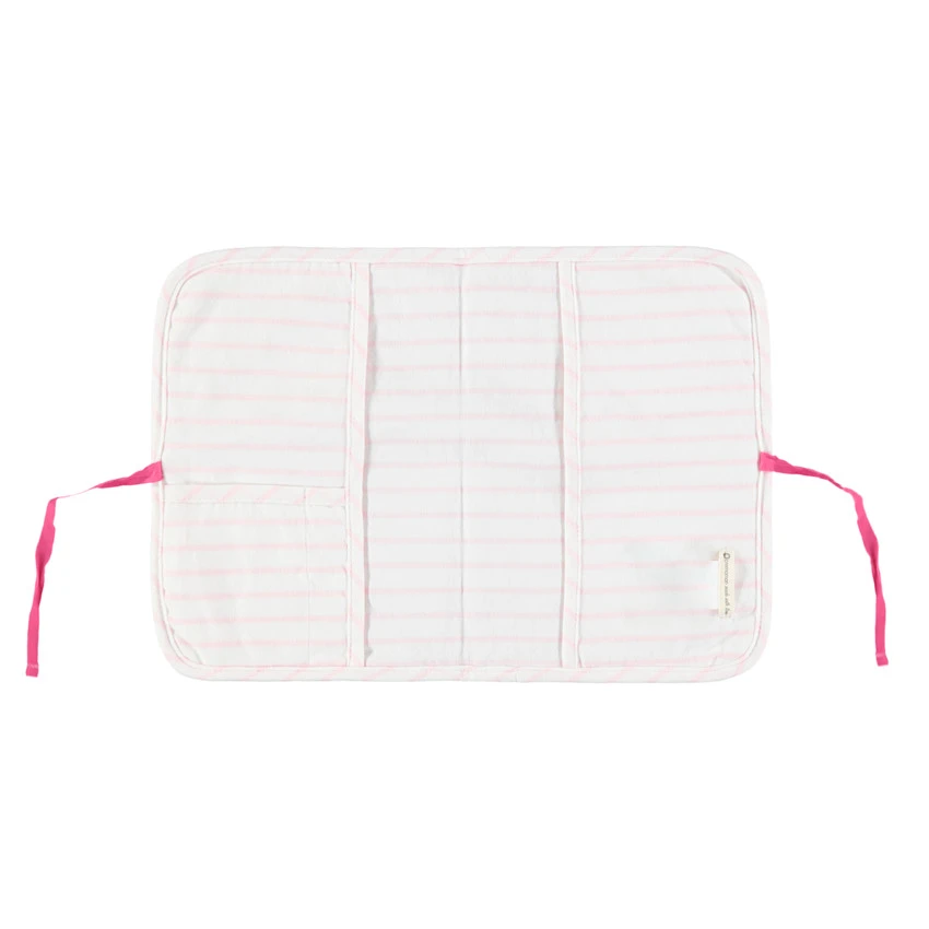 Intérieur rayé avec compartiments. Ouverture par liens à nouer.