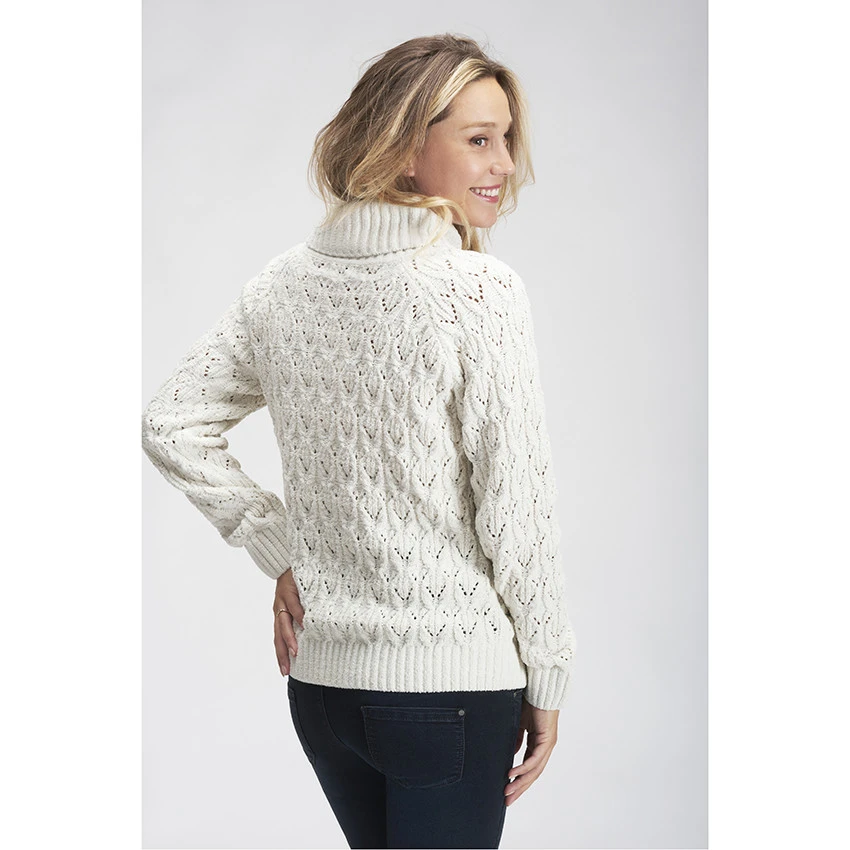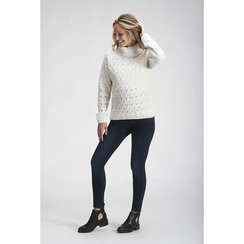 Pull de grossesse en maille fantaisie ajourée légèrement brillante. Col roulé en maille extensible. Poignets et base en maille extensible.