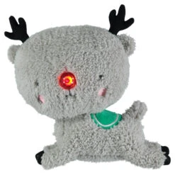 Renne en peluche. Intérieur ouatiné. Détails brodés. Nez plastifié qui s’illumine lorsque l’on presse son cou.