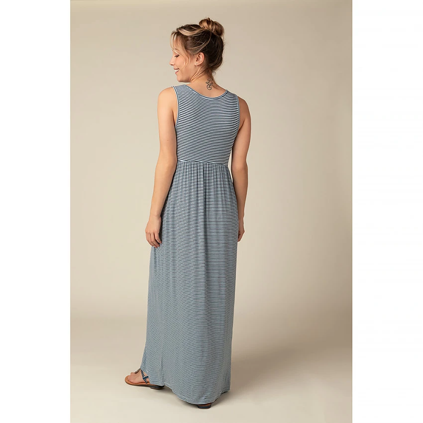Robe longue. Encolure ronde avec superposition effet cache-coeur. Ouverture au niveau de la poitrine pour l’allaitement. Taille élastiquée. Rayures all-over.