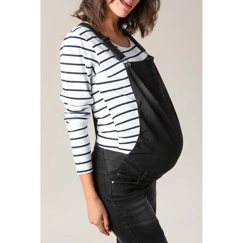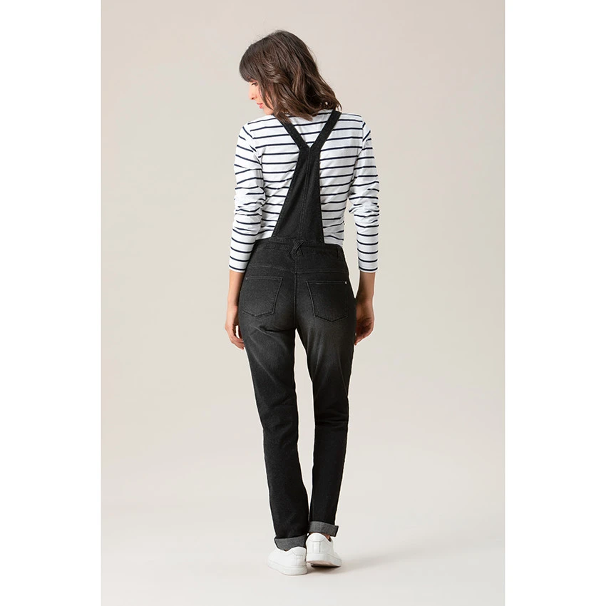 Salopette de grossesse en jean effet used. Bretelles ajustables. 1 poche plaquée sur le devant. Taille à passants. 2 poches cavalières. 2 poches plaquées au dos.