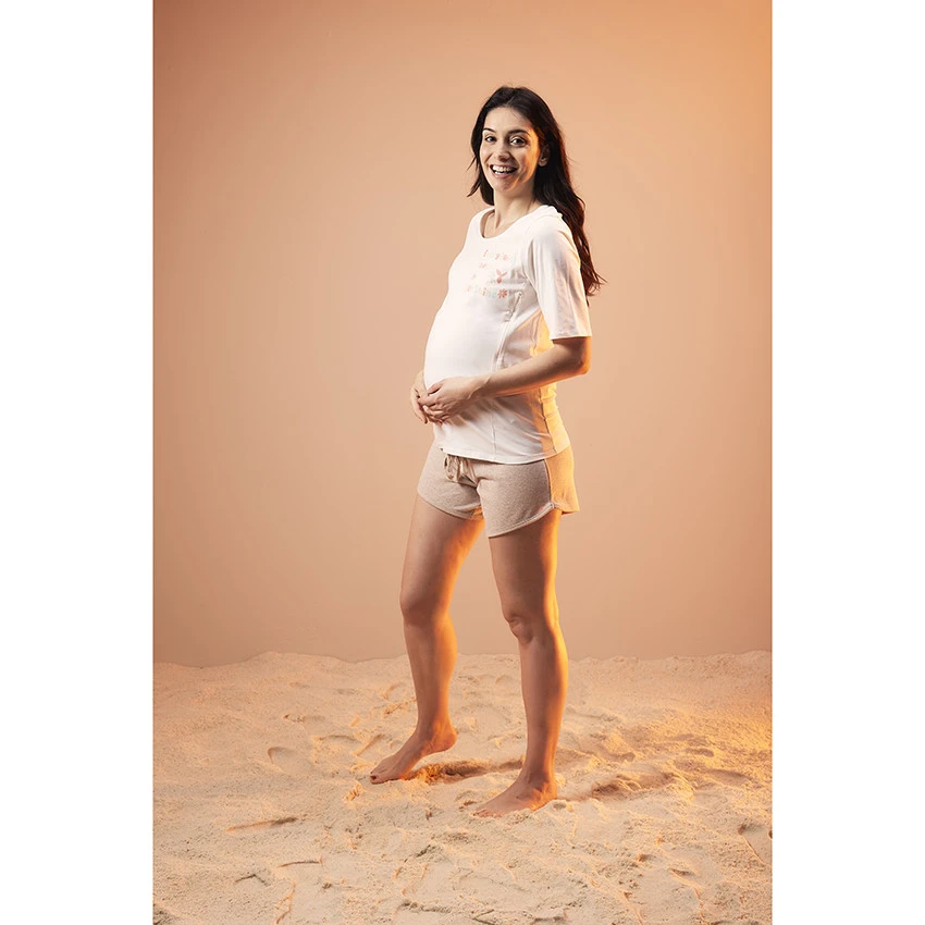 Short de grossesse. Bandeau haut pour plus de confort, fronces sur les côtés. Taille élastiquée avec cordon de serrage. Couleur unie.