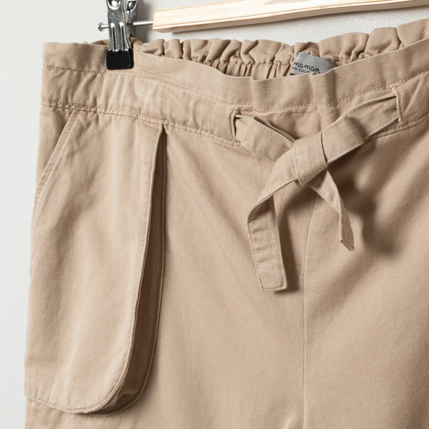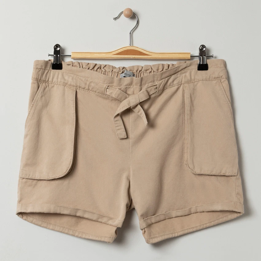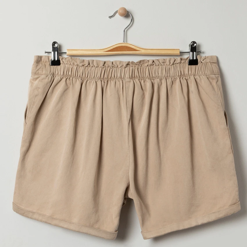 Short de grossesse uni. Toile légère en fibre cellulosique de bois qui offre une évacuation optimale de l’humidité pour le bien-être de la peau. Taille basse élastiquée à cordons de serrage pour l’adapter aux nouvelles courbes du ventre. 2 poches coupées devant. Revers fixes.