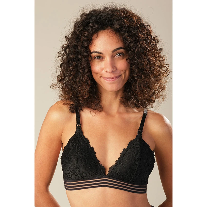 Soutien-gorge en dentelle. Bonnets doublés. Sans armatures. Bretelles ajustables à clips pour faciliter au maximum l’allaitement. Base du soutien-gorge élastiquée et délicatement ajourée. Ouverture ajustable au dos par système d’agrafes.
