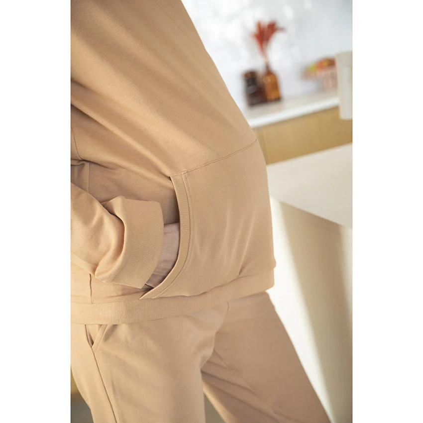 Sweat en molleton à capuche. Cordon de serrage contrastée. Ouverture large sur le devant pour faciliter l’allaitement. Poche kangourou.