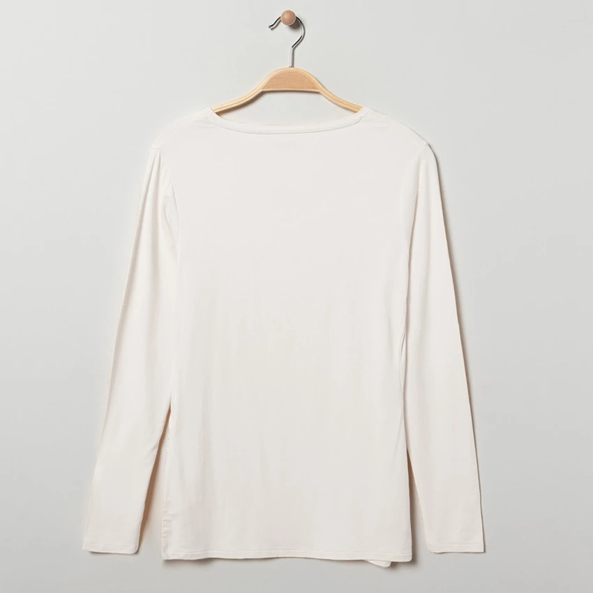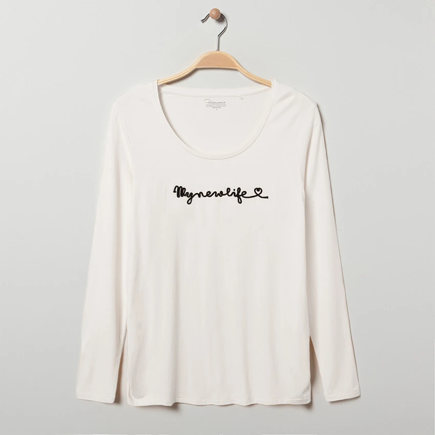 T-shirt de grossesse à manches longues. Col rond. Inscription sur le devant. Dos uni.