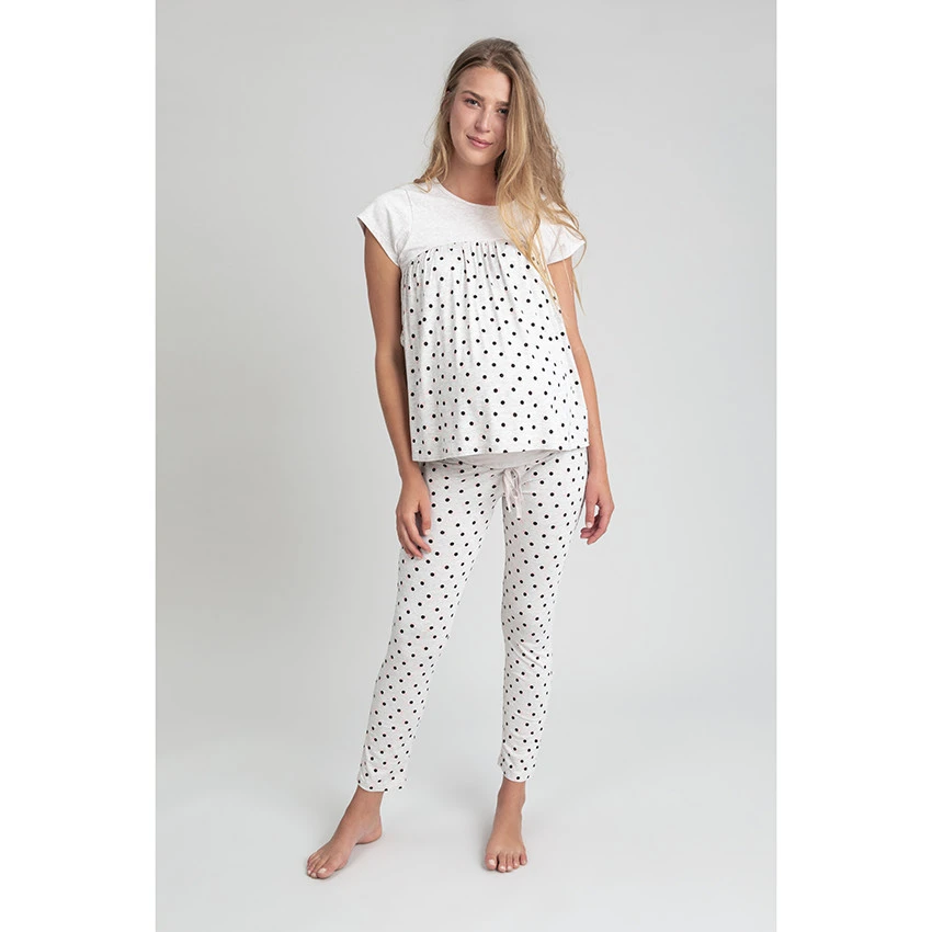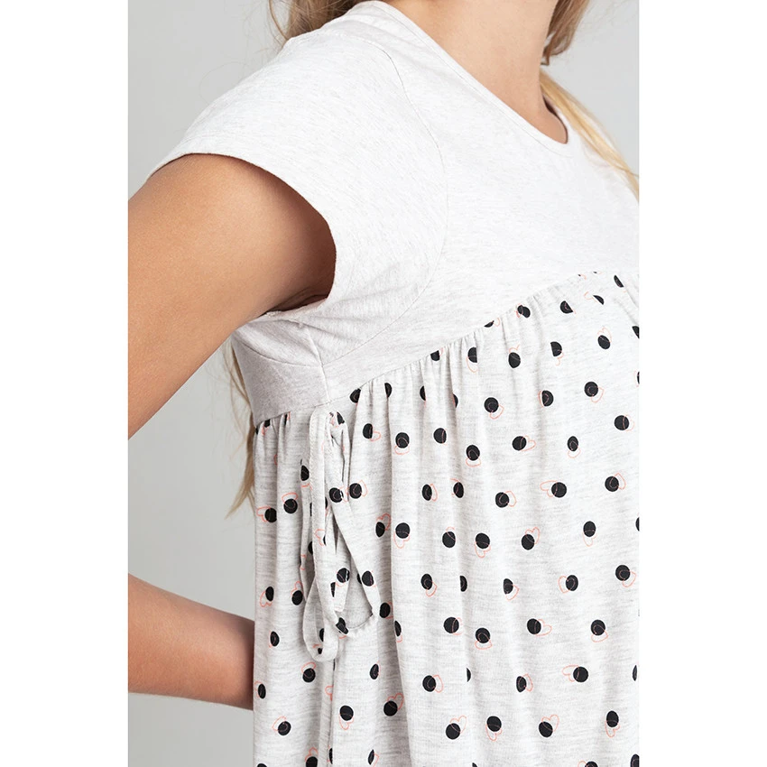 T-shirt de grossesse homewear. Pois imprimés sur le bas. Découpe sous poitrine avec nouettes sur les côtés.