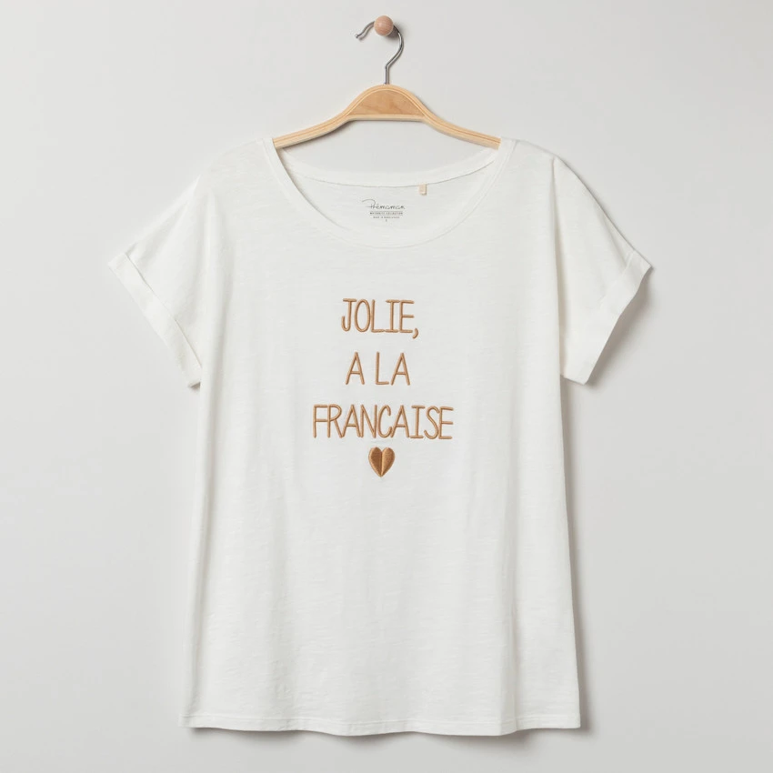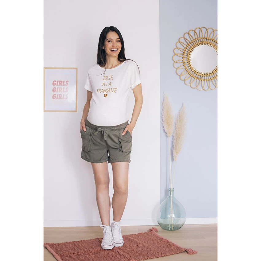 T-shirt de grossesse manches courtes. Encolure ronde en bord-côte. Message doré brodé en relief sur le devant. Dos uni. Revers fixes au bout des manches.