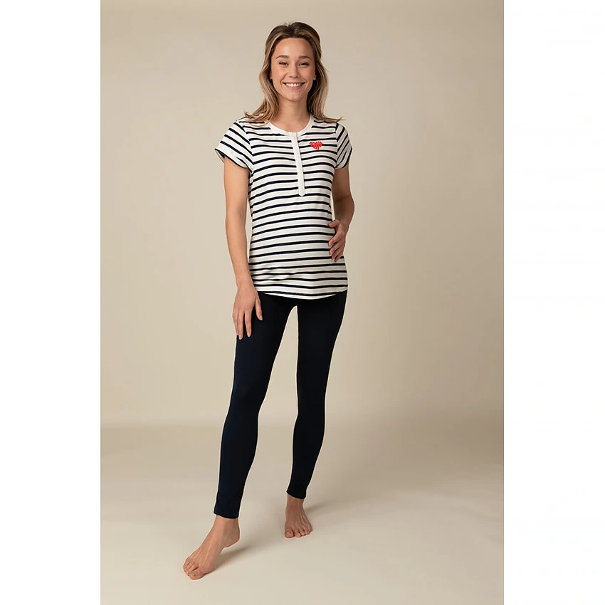 T-shirt manches courtes en jersey. Coloris écru. Rayures placées et contrastées all-over. Encolure ronde avec ouverture pressionnée sur le devant. Broderie cœur côté cœur.