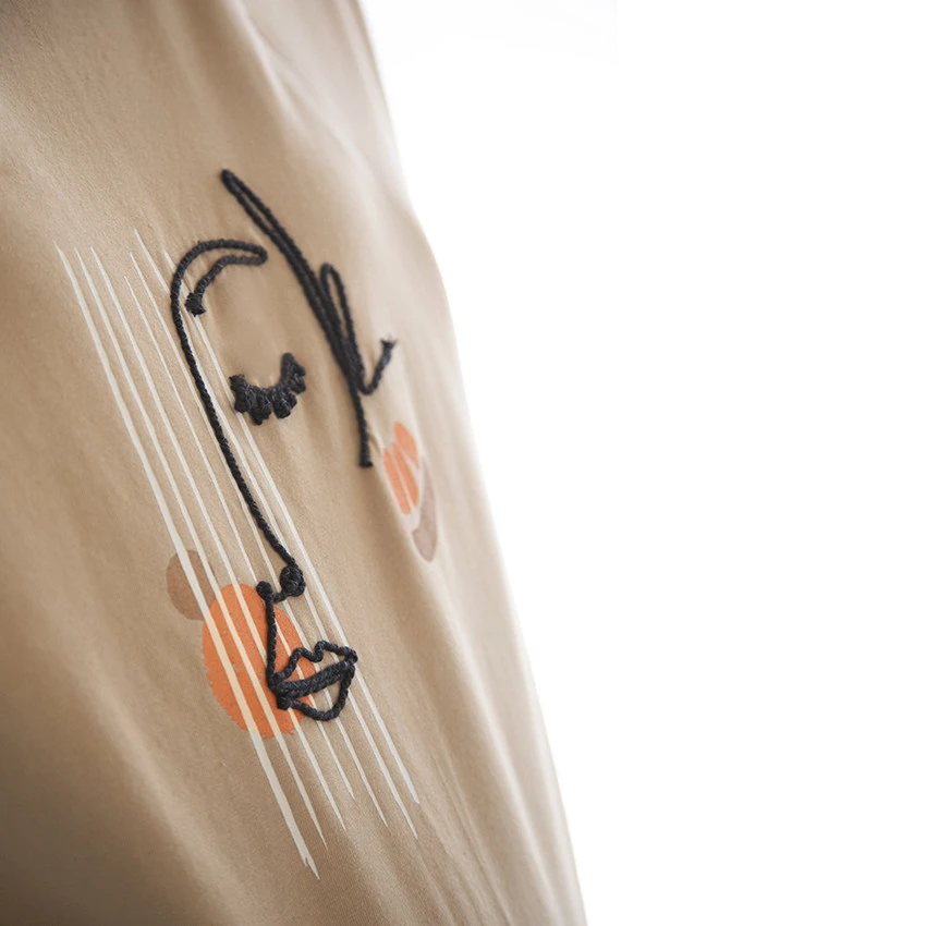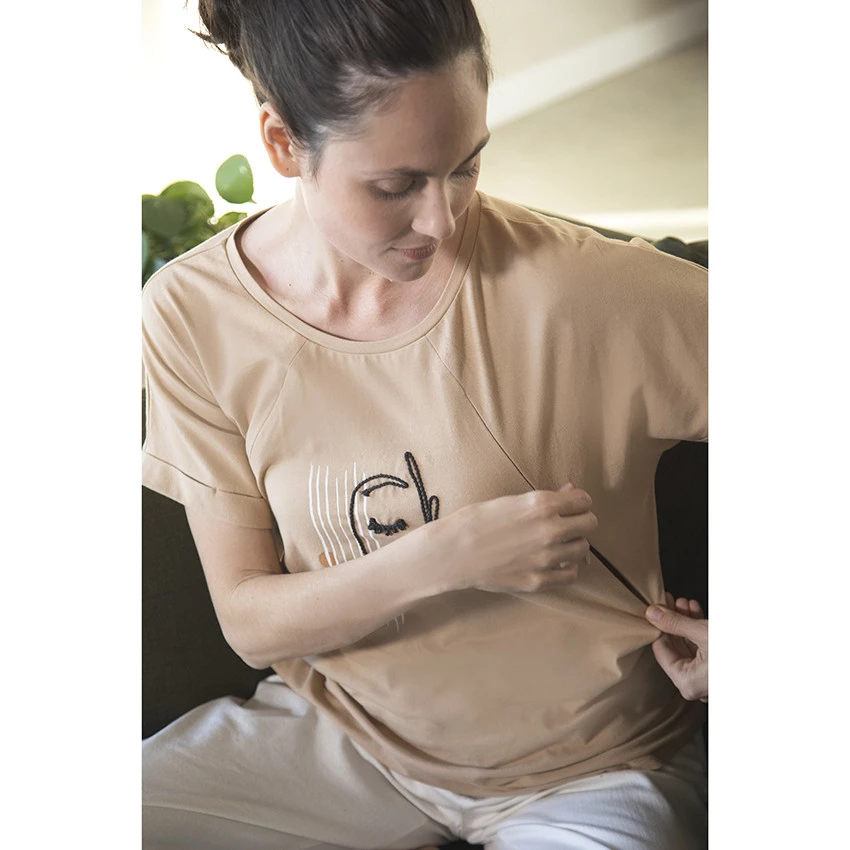 T-shirt manches courtes. Col rond. Motif cousu en relief sur le devant. Revers au niveau des manches. Zip pour allaitement sur le devant. Dos uni.
