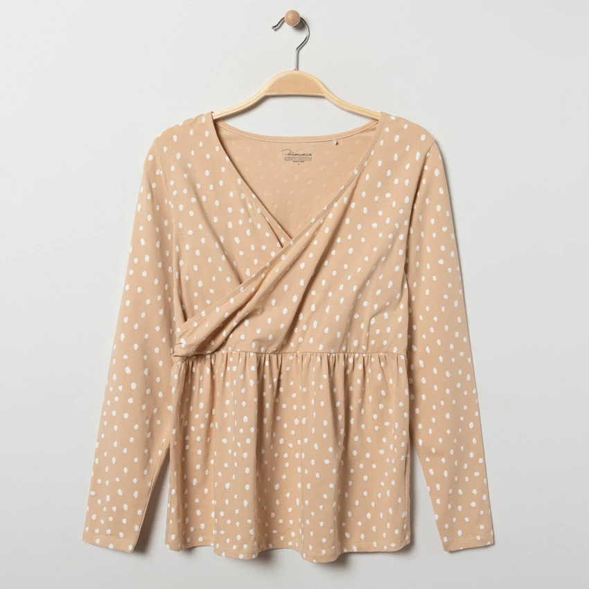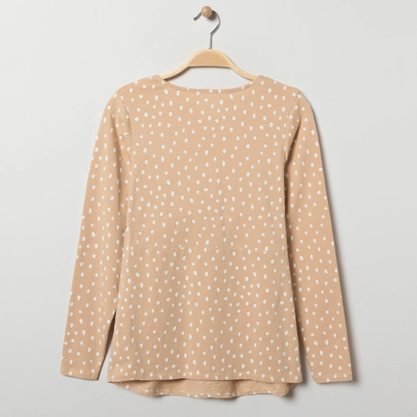 T-shirt de pyjama manches longues de grossesse. Col en V pour faciliter l’allaitement. Motif à pois all-over.