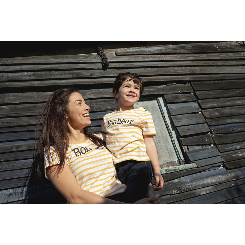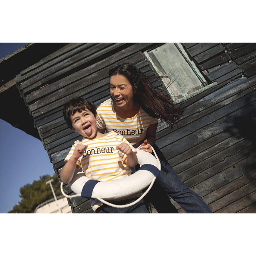 T-shirt manches courtes. Encolure ronde. Revers fixes sur les manches. Print « Bonheur » sur le devant. Rayures all-over. Tricoté en France, au sein de notre usine de Roanne.