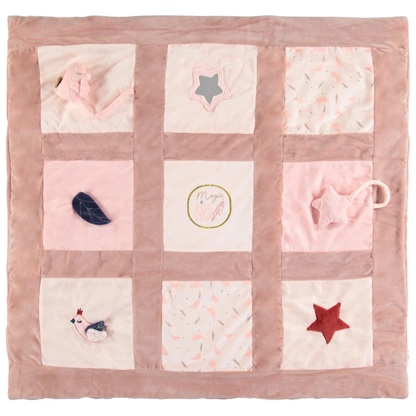 Bébé va passer des heures à jouer sur son tapis d’éveil. Tapis d’éveil en velours pour apporter un maximum de confort à bébé. Détails en broderie dorée. Ce tapis contient des éléments en relief ludiques : miroir, peluches, grelot, pouet pouet et papier craquant.