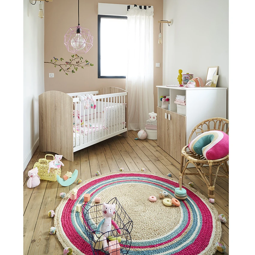 Apportez une touche naturelle à la chambre de votre enfant avec ce tapis rond en jute et ses jolis détails colorés.