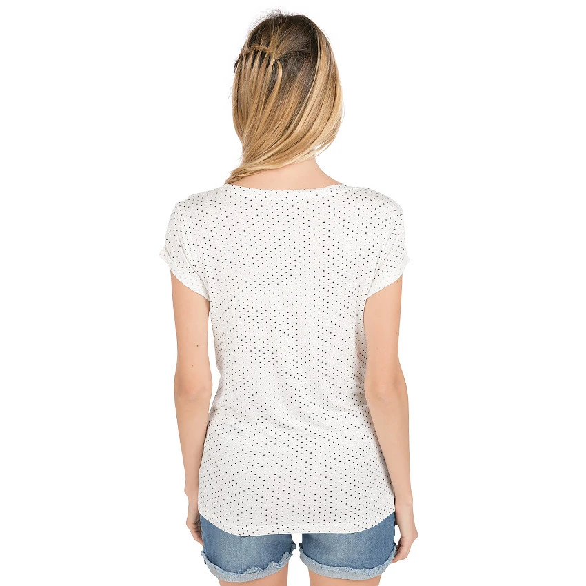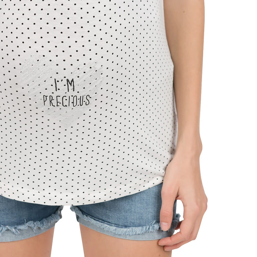 Tee-shirt manches courtes de grossesse. Encolure ronde. Revers fixes au bout des manches. Fronces sur les côtés. Print fantaisie sur le devant.