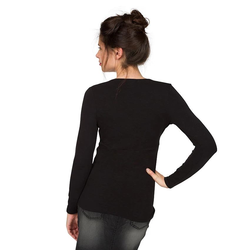 T-shirt de grossesse et d’allaitement manches longues uni. Coloris différents selon le modèle. Col croisé devant avec ouverture à l’intérieur pour permettre l’allaitement. Dos uni.
