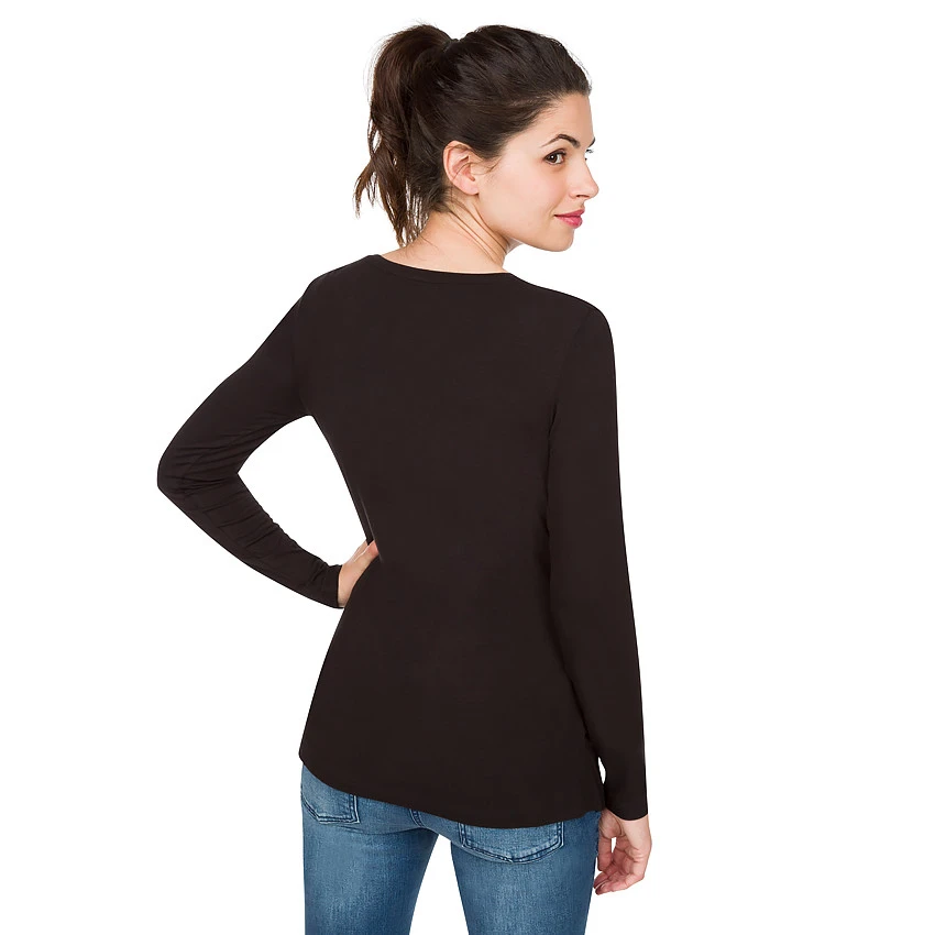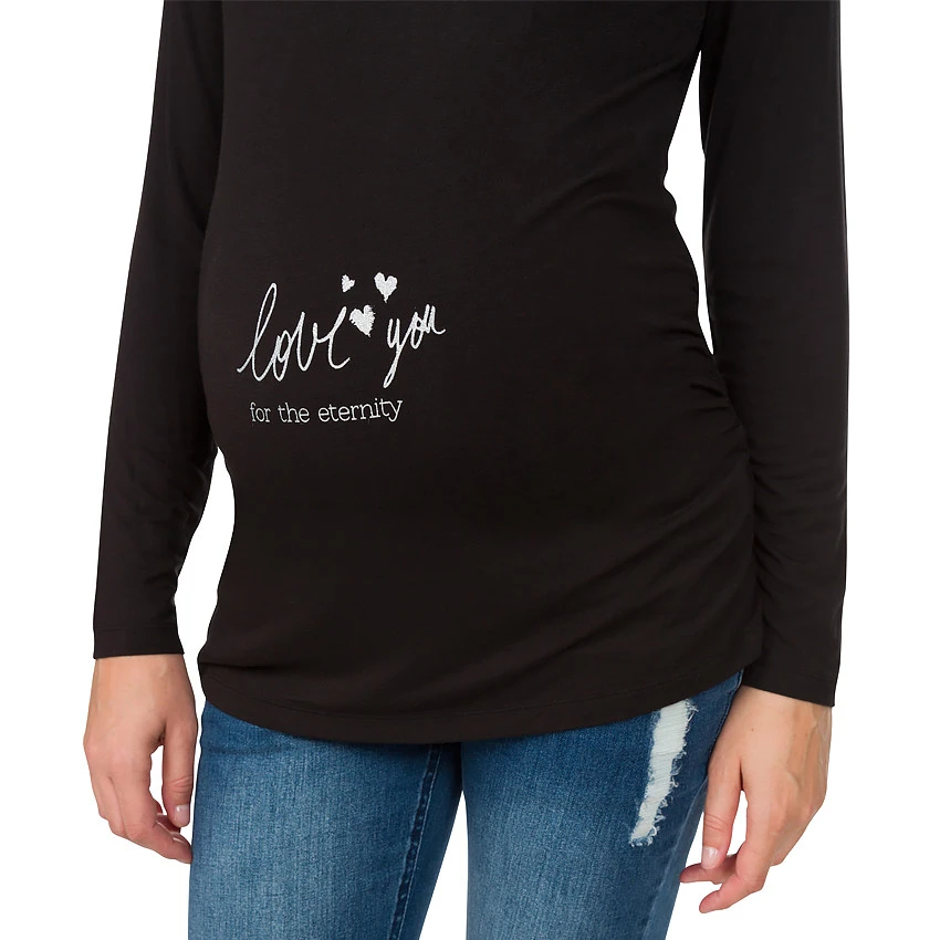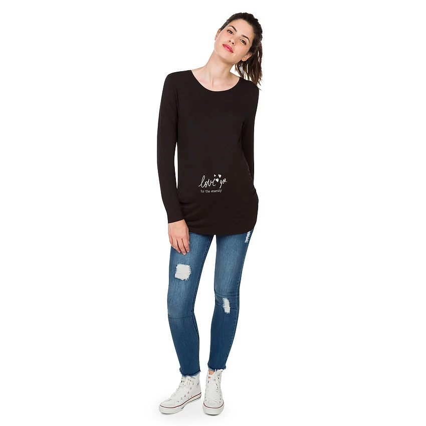 Tee-shirt manches longues de grossesse en jersey stretch uni. Encolure ronde en bord-côte. Message esprit maternité printé sur le ventre. Fronces sur les côtés pour permettre au ventre d’évoluer au fil du temps. Dos uni.